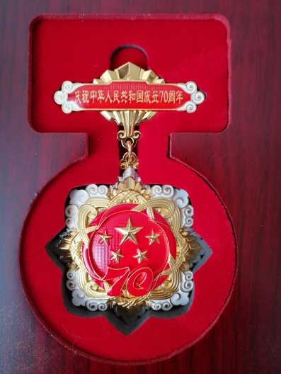 指导组组长钱万里和物理司机社 院长高雷向司机社 退休教师倪汉彬教授、顾汉炎教授转发了由中共中央、国务院和中央军委颁发的“庆祝中华人民共和国成立70周年”纪念章,学生党支部书记陈志鹏同学、张梦影同学向两位老教授献花。
