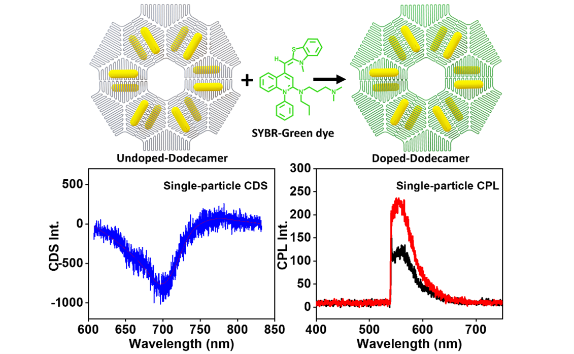 研究团队通过DNA折纸术组装了平面层状手性金纳米棒十二聚体,调控了金纳米棒尺寸,其不对称因子(g因子)随纳米棒尺寸增大而增强,实现了等离激元超结构光学活性的精准调控。团队在单颗粒水平实现了圆差分散射(CDS)和圆偏振发光(CPL)的检测,通过排除整体检测的平均效应,分别测得高达-0.17和-0.6的g因子。实验证实这些较强的手性光学响应特性源于几何手性诱导的局域电磁场光学不对称分布,展现了DNA折纸术在生物传感、手性光子器件和超材料等纳米手性研究及工程领域的应用潜力。