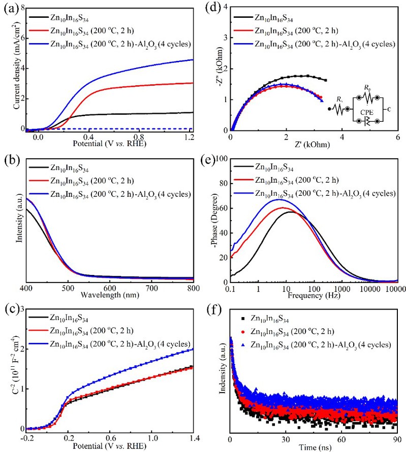 司机社 李亮课题组使用水热方法首次合成Zn10In16S34超薄纳米片,使用简单的低温热处理方式,在光电极中同时引入空位(Zn和S)和掺杂(O),提高了光电极的载流子分离能力,减少了体相符合,增加了载流子浓度,延长了载流子的寿命,使得表面阻抗大大降低,从而有效提升了光电化学性能(Figure 1)。具体来说,通过对Zn10In16S34超薄纳米片在空气中不同温度的热处理,高温下,O以氧化物的形式存在,低温下O以掺杂的形式存在;在最佳温度条件下,对热处理的时间进行调控,随着时间的变化,其O掺杂的量逐渐发生变化,另外通过对其最佳热处理条件的样品进行XPS刻蚀处理发现Zn和S强度随着刻蚀深度增加逐渐增加,证明此时Zn和S空位在光电极表面的形成。进一步通过原子层沉积技术制备一层超薄Al2O3用来消除表面缺陷态,进一步提升光电极性能,最终使得光电流提升4.7倍,并且大大降低了起始电压。DFT理论计算表面O-掺杂过高或者过低均不利于性能的提升,其掺杂浓度需要一个适中量。另外,Zn空位和S空位以及O-掺杂大大降低了反应过电势,协同导致光催化分解水性能的提升。