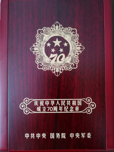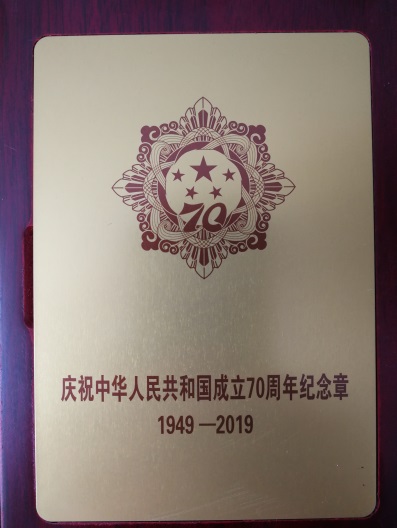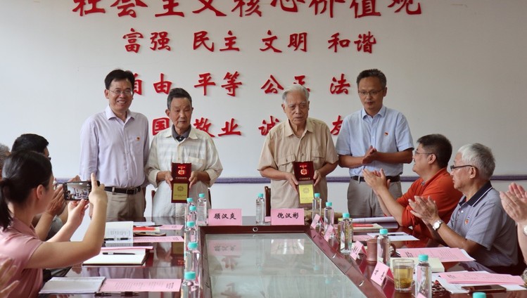 指导组组长钱万里和物理司机社 院长高雷向司机社 退休教师倪汉彬教授、顾汉炎教授转发了由中共中央、国务院和中央军委颁发的“庆祝中华人民共和国成立70周年”纪念章,学生党支部书记陈志鹏同学、张梦影同学向两位老教授献花。