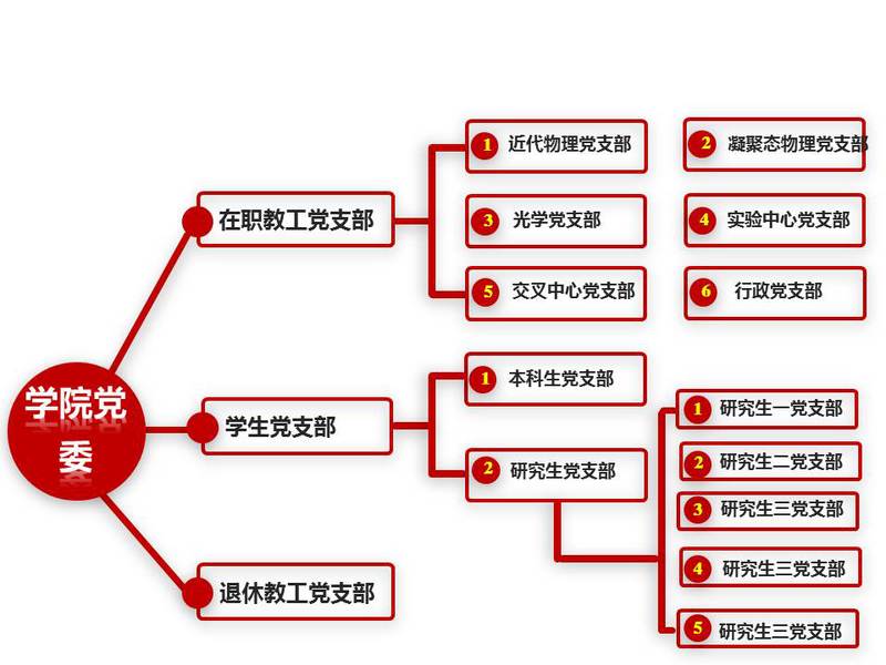 物理司机社 党委现下设有13个党支部,其中6个在职教工党支部,1个退休教工党支部,5个研究生党支部,1个本科生党支部。