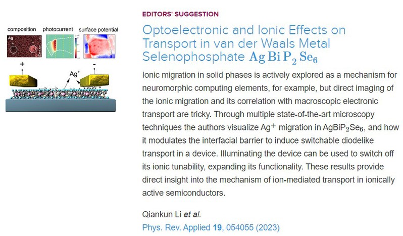 相关工作以“Optoelectronic and Ionic Effects on Transport in van der Waals Metal Selenophosphate AgBiP2Se6”为题发表在Physical Review Applied上,并被选为Editor’s Suggestion进行了亮点报道。物理司机社 硕士研究生李乾坤为文章的第一作者,方亮教授和游陆教授为论文的共同通讯作者。
