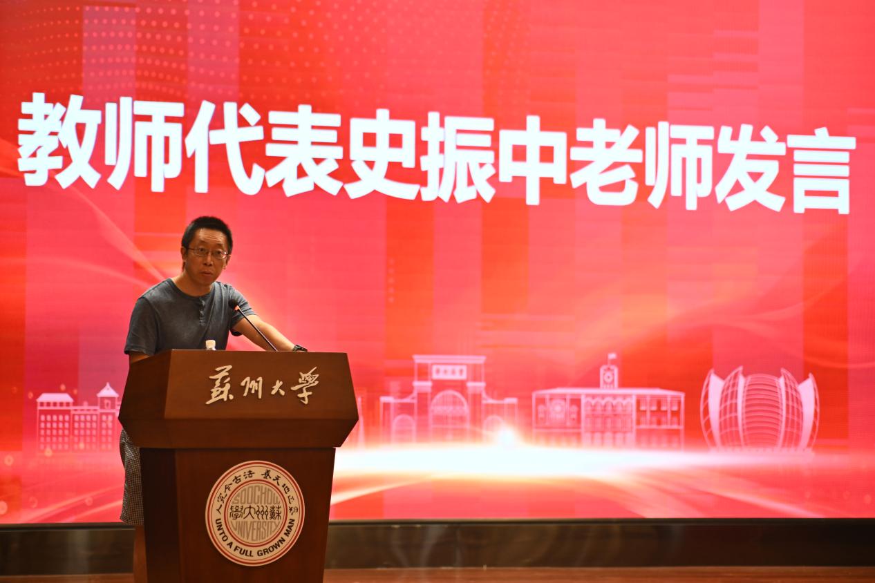教师代表史振中老师在发言中强调了自主学习与批判性思维的重要性,他鼓励学生们培养实验能力和动手操作的技能,以增强解决实际问题的能力。同时,史老师也着重提到了团队合作和沟通能力的必要性,指出这些技能对于个人综合素质的提升至关重要。他倡导学生们在追求学术成就的同时,也要关注身心健康,努力成为德才兼备的优秀人才,以实现自我价值和人生目标。