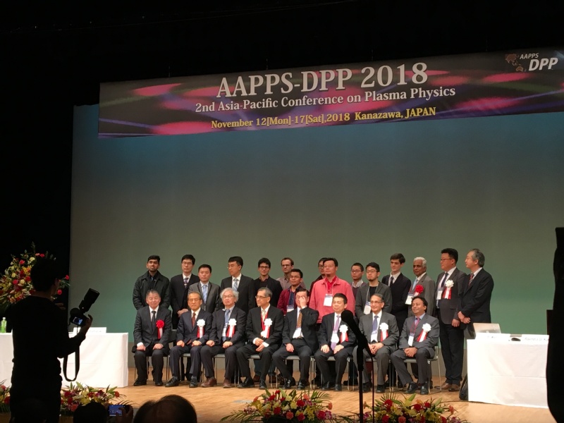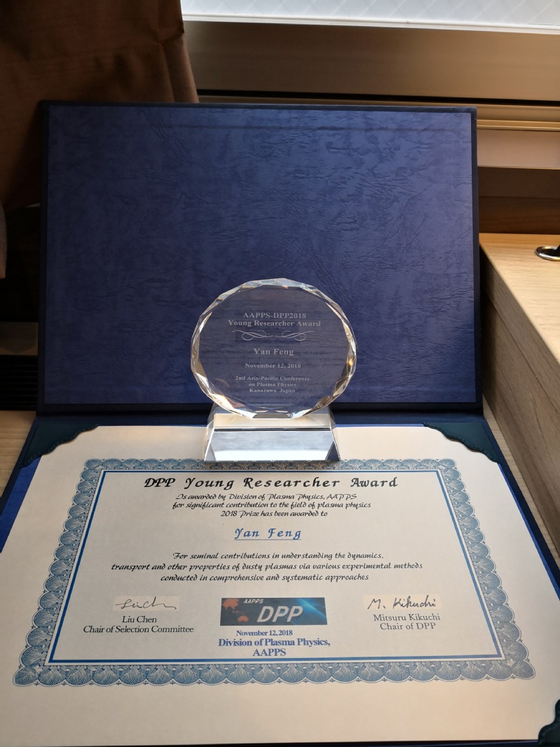2018年11月12日-11月17日期间,第二届亚太等离子体物理会议(AAPPS-DPP 2018)在日本金泽召开。司机社 冯岩教授获得了亚太等离子体物理青年研究奖(AAPPS-DPP Young Researcher Award),以表彰他在利用多种实验手段,对深入且系统地理解尘埃等离子体的动力学、输运、和其他物理性质方面所作出的多项原创性贡献(For seminal contributions in understanding the dynamics, transport and other properties of dusty plasmas via various experimental methods conducted in comprehensive and systematic approaches)。
