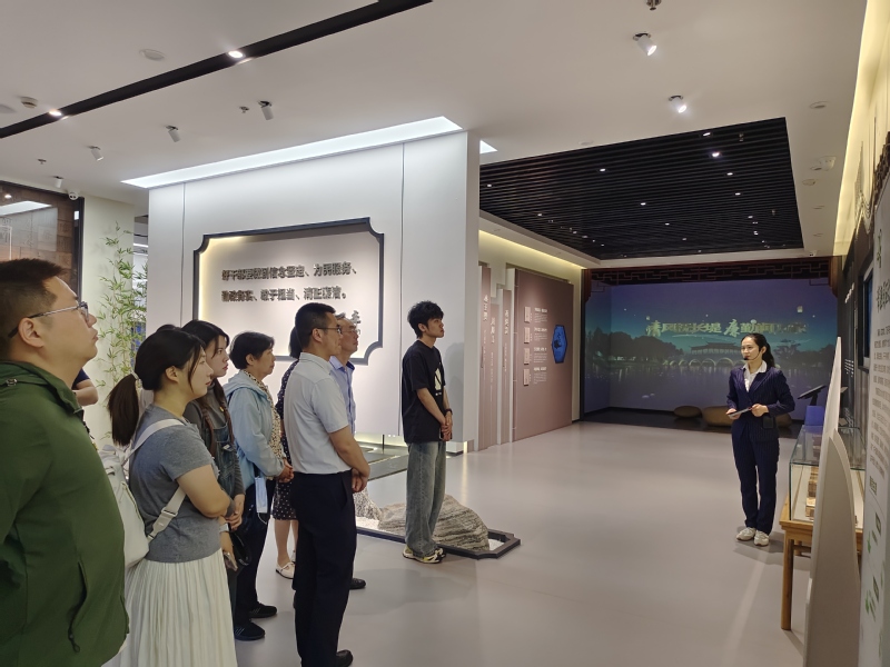党员一行首先走进李公堤廉勤文化馆古代展区,沿着“源起李公堤,寻江南风骨”的脉络,探寻廉勤文化的历史渊源。馆内以“廉勤为民”为核心,通过苏工、苏作精品与多媒体展陈,立体呈现了以清代廉吏李超琼为代表的古代清官事迹。在“李超琼与李公堤”专题展区,党员们驻足观看光绪年间李超琼“以工代赈”修建金鸡湖堤坝的史料档案 —— 从实地勘察时“抱病督工”的记载,到竣工时“移舟穿曲浦,堤势偃长虹”的诗句,生动展现了其“为官一任、造福一方”的担当精神。馆内陈列的姚建萍“清莲园区”双面绣、蔡云娣清官砖雕等艺术作品,将江南廉韵与传统工艺巧妙融合,让党员们直观感受到“以廉为美、以勤为贵的文化浸润。