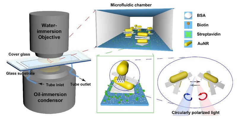 集合样品的检测是基于均相体系的,对于等离激元超构分子来说,当体系中同时存在左手型及右手型异构体时,它们的圆二色信号往往相互抵消,掩盖了体系中个体的真实状态。采用单颗粒表征手段,可以分辨异构体特征并追踪到个体的差异性。但是,在单颗粒实验中,动态的等离激元手性超构分子会由于基底的范德华力吸附而出现结构破坏等问题。