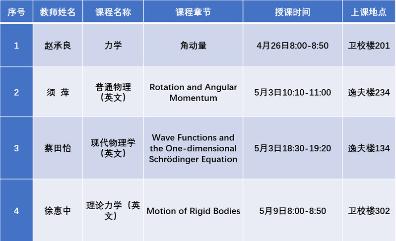 赵承良老师讲授“力学”示范课,回顾“天宫课堂”陀螺运动试验,介绍“心怀祖国、勇于创新、甘于奉献”的陀螺精神,引出教学主题“角动量”及“角动量守恒”,赵老师结合科普教育,通过润物细无声的方式有机融入思政内容,注重对学生思想价值的引领。须萍老师带来一堂生动的《普通物理》(英文)习题课,结合雨课堂信息化教学手段实现了实时互动,及时掌握课堂答题情况,帮助学生更好把握转动及角动量章节的重难点。蔡田怡、徐惠中老师分别讲授《现代物理学(英文)》与《理论力学(英文)》,结合演示实验,积极与学生互动,引导启发式授课。四位老师的课堂展示出了各自的特色和风采,起到了公开示范的重要作用,也成为司机社 推广优质课程的重要渠道。