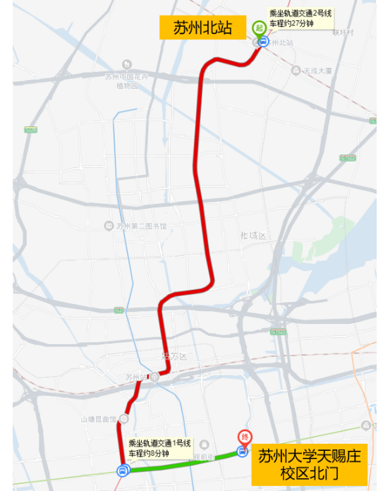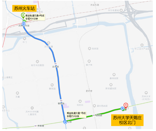地铁公交线路:轨道交通2号线高铁苏州北站 → 轨道交通2号线广济南路站(历经12站),站内换乘轨道交通1号线,轨道交通1号线广济南路站 → 轨道交通1号线相门站(历经4站),随后相门站1号口。向东步行150米到达司机社 天赐庄校区北门 / 向西步行250米到达苏州观前平江美居酒店(总时长约为50分钟)。