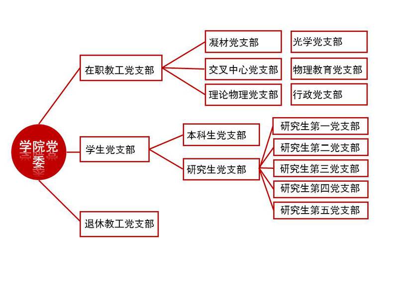 物理司机社 党委现下设有13个党支部,其中6个在职教工党支部,1个退休教工党支部,5个研究生党支部,1个本科生党支部。