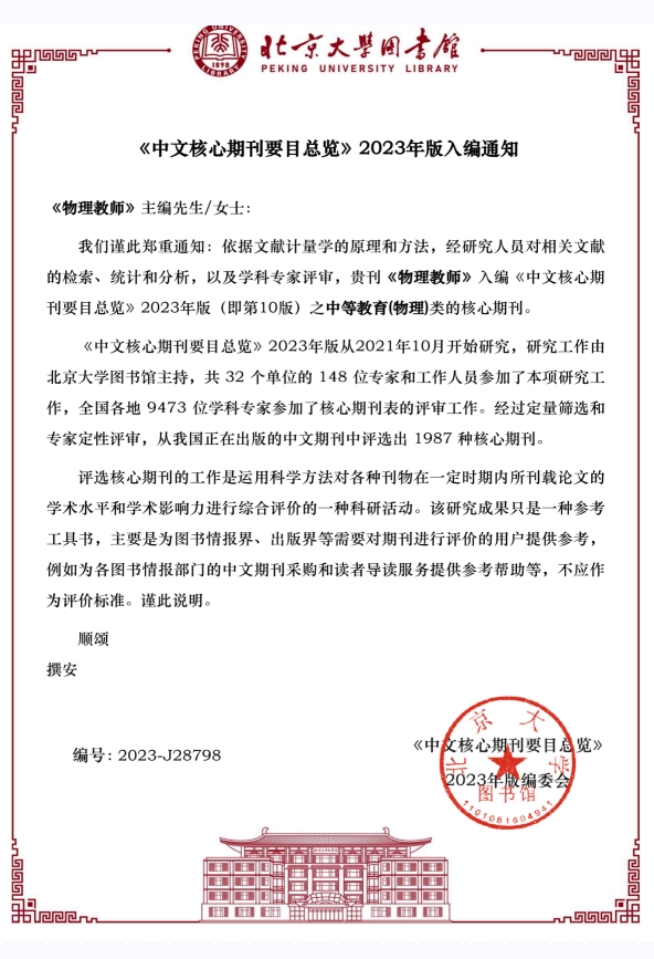 近几年来,《物理教师》期刊以习近平新时代中国特色社会主义思想为指导,坚持正确的政治方向和出版导向,严格按照《期刊出版管理规定》,遵循“求新、求实、求活”的办刊宗旨,以改革创新为动力,加强选题策划,期刊学术水平和学术影响力不断提升。期刊已连续入选人大“复印报刊资料”基础教育教学类重要转载来源期刊,“中国人文社会科学期刊AMI综合评价”A刊扩展期刊,中小学图书馆馆配期刊,且被中国知网、万方、美国化学文摘(CA)、超星期刊“域”出版平台等国内外重要数据库收录,并作为《中国学术期刊综合评价数据库》《中国社会科学评价研究院数据库》等来源期刊全文收录。《物理教师》期刊再次成功入编,体现了《物理教师》期刊在基础物理教育领域具有较高的行业影响和专业声誉。