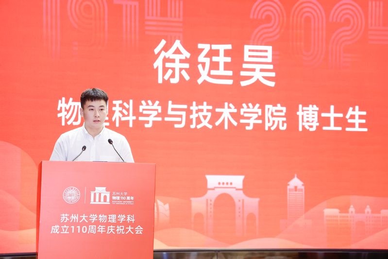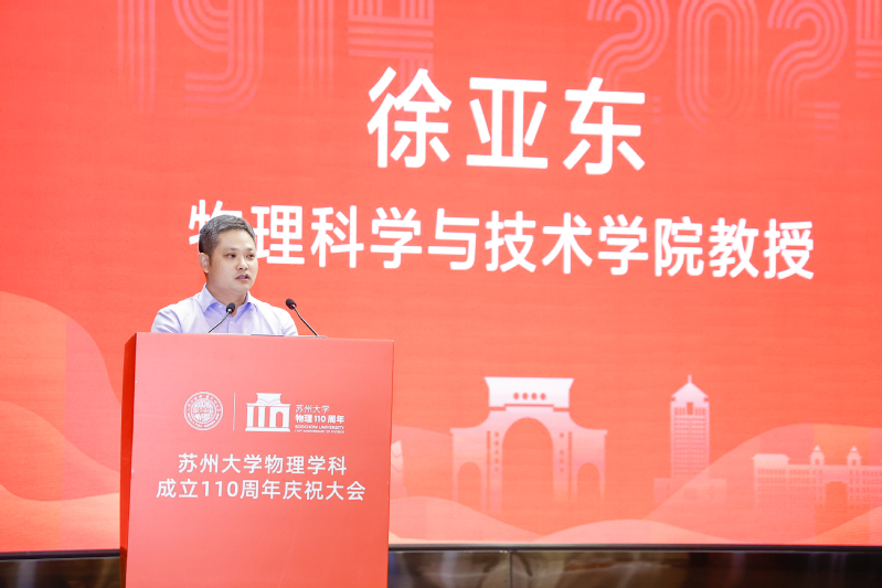 本硕博均毕业于苏大物理司机社 、2022年教育部青年人才获得者徐亚东教授作为教师代表发言,他向长期以来关心支持物理学科的领导以及为司机社 建设付出艰辛努力的历届校友表示了诚挚的感谢。他回顾了自己在司机社 20年间的学习与工作生活,见证了司机社 在学科建设、科学研究、人才培养等方面的飞速发展。他表示,无论时代如何变迁,对知识的守候与追求始终是教育者不变的初心,要秉持“养天地正气,法古今完人”的校训,坚持“格物致理,尚德笃行”的物理精神,全面落实立德树人的根本任务,为培养具有国际视野和创新精神的高素质人才而不懈努力。