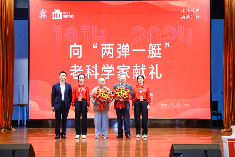 两名物理司机社 本科生向“两弹一艇”老科学家魏品良老师和姜士勇老师鲜花,向老一辈科学家致以最崇高的敬意。