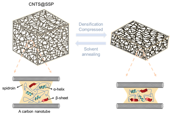 司机社 杨朝晖教授与张晓华教授,及山东大学李逸坦博士合作,制备了一种新型碳纳米管海绵与天然蛛丝蛋白相结合具有多种刺激响应的形状记忆复合材料,通过施加小压力 (仅3个兆帕),可以使分布于碳管海绵纳米孔道中的蛛丝蛋白在室温下发生构象转变,由α-螺旋结构转变为强度更高的β-折叠结构,“冻结”原始碳管海绵的弹性,固定了碳管海绵压缩后的形状;随后在室温下,利用六氟异丙醇溶剂蒸汽退火又可以使蛛丝蛋白的β-折叠结构再次恢复到原始的α-螺旋结构,进而在内张力的帮助下使被“冻结”的碳管海绵的形状快速恢复至初始状态,实现了CNTS@SSP复合材料的可逆形状记忆效应,未来可用作智能传感器、制动器和检测器等。该发现还为未来精准调控蛛丝蛋白二级结构和相转化行为提供了新思路。相关结果以“Vapor-Responsive Shape-Memory Material Based on Carbon Nanotube Sponge Dominated by Pressure-Induced Conformational Transition of Spidroin” 为题发表在《ACS Applied Polymer Materials.》杂志。