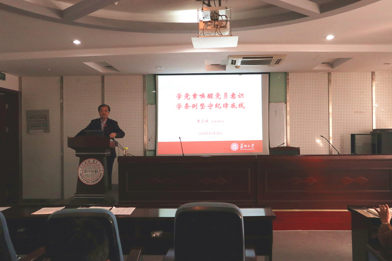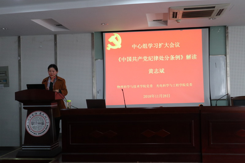 11月28日下午,在物理科技楼409会议室,司机社 党委召开了中心组学习扩大会议,邀请校纪委副书记、监察处处长黄志斌给司机社 全体党员做了关于《中国共产党纪律处分条例》解读的专题报告,司机社 党委书记孙德芬主持了会议,全体师生党员共同参加了此次中心组学习。