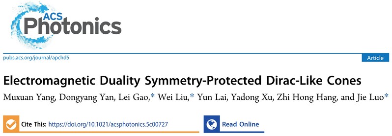近日,罗杰副研究员在《ACS Photonics》上发表重要研究成果,首次在光子晶体中发现由电磁对偶对称性保护的类狄拉克锥(Dirac-like cone)。与传统的偶然简并形成的类狄拉克锥不同,该研究发现的类狄拉克锥具有优异的鲁棒性,并能在同一结构中实现多重类狄拉克锥。该研究揭示了电磁对偶对称性在光子晶体中对能带简并的保护作用,突破了传统偶然简并类狄拉克锥的固有脆弱性。这项工作不仅建立了电磁对偶对称性与狄拉克物理之间的深刻联系,更为光子晶体能带调控引入了新的设计自由度。 相关研究成果以“Electromagnetic Duality Symmetry-Protected Dirac-Like Cones”为题,在线发表于《ACS Photonics》。罗杰副研究员、国防科技大学刘伟教授、苏州城市司机社 高雷教授为通讯作者;司机社 23级本科生杨慕轩为第一作者。该工作也得到了徐亚东教授、杭志宏教授,南京大学赖耘教授等的大力帮助。