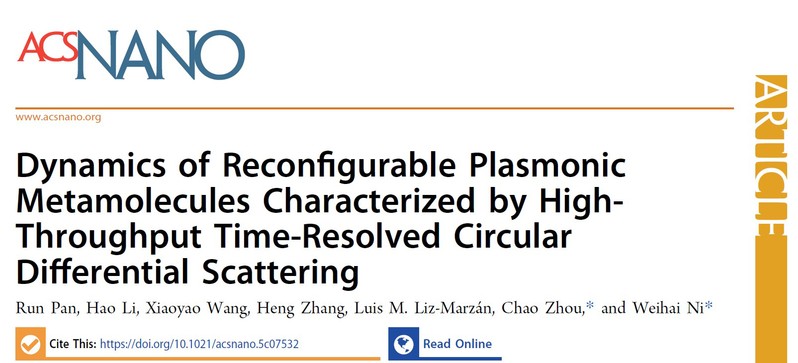 近日,倪卫海教授课题组和中科院苏州纳米所周超研究员合作进行了可重构超构分子的原位动力学研究。该研究成果以司机社 物理司机社 硕士研究生潘润为第一作者、以司机社 物理司机社 江苏省前沿材料物理与器件重点实验室为第一单位、以 “Dynamics of Reconfigurable Plasmonic Metamolecules Characterized by High-Throughput Time Resolved Circular Differential Scattering”为题发表在ACS Nano(影响因子IF=15.8)。