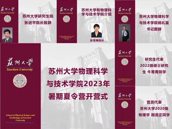 仪式伊始, 研究生院张进平院长向踊跃参与暑期夏令营的全国各地的营员表示热烈欢迎,并向营员们介绍了司机社 研究生教育教学概况、人才培养理念以及学科特色及建设等情况,并鼓励营员们借助本次夏令营活动,为未来的学习和发展明确方向、希望大家能够在这次活动中有所收获。吴雪梅院长就司机社 的历史沿革、科研平台、师资队伍、人才培养与教学、社会服务等做了全面介绍,并诚挚邀请同学们来司机社 交流和学习。司机社 2022级硕士研究生牛菁菁、2020级本科生顾浩正同学以学生视角分别从学风建设、奖助政策、实验科研及课余生活等方面向营员介绍了自己在读期间的学习、科研及生活经历,分享了个人的成长、收获,增进了营员对物理司机社 的了解。最后,杨礼富书记至欢迎辞,他表示苏州得天独厚的人文地理优势和自身办学条件优势为培养优秀的创新型人才创造了有利条件,并鼓励各位营员能够尽早确定自己的研究兴趣和目标,通过本次夏令营丰富多彩的活动,能够选择苏大、爱上物理,并祝愿本次夏令营活动圆满成功。