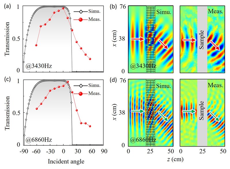 图2:实验验证及结果。(a, c)分别在3430Hz和6860Hz时,不同入射角和透射率之间的关系。(b, d)声波在对应频率下正入射于PGM,实现了完美且相同的异常折射。