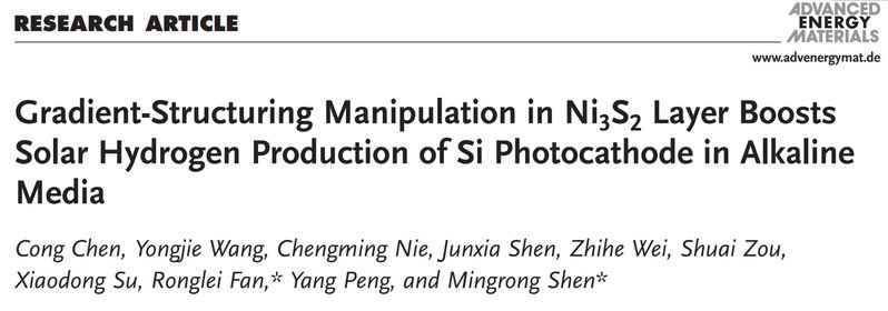 近日,司机社 范荣磊助理研究员(共同通讯作者)、沈明荣教授(共同通讯作者)与合作者在构建高效稳定Si光阴极用于碱性太阳能分解水制氢方面取得了创新性成果。相关工作的第一作者为2021级博士研究生陈聪,以司机社 为第一单位,以“Gradient-Structuring Manipulation in Ni3S2 layer Boosts Solar Hydrogen Production of Si Photocathode in Alkaline Media”为题发表在Advanced Energy Materials上。(影响因子:29.368)