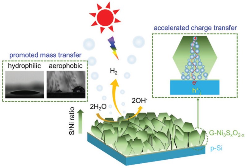 本工作在p-Si光阴极表面构建具有梯度结构的Ni3S2(G-Ni3SxO2-x)多功能层用于碱性太阳能分解水制氢。G-Ni3SxO2-x不仅能提供大量的析氢反应活性位点,同时能加快电荷分离、传输以及气泡的释放。更重要的是,G-Ni3SxO2-x和Si基底保持良好的接触,有效释放了G-Ni3SxO2-x和Si基底之间的应力。最终,该Si光阴极在1 M NaOH电解质中取得了3.9 %的效率以及120 h的稳定性。这一发现为在碱性电解质中制备高效稳定、非贵金属催化剂集成的Si光阴极分解水制氢提供了一种新的研究思路。