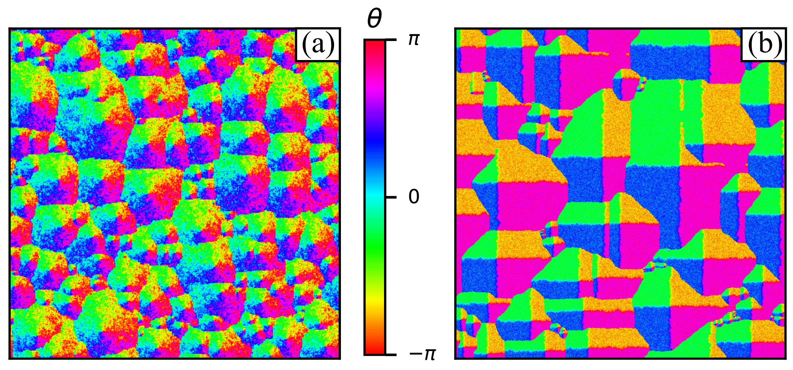 图一:有序态因拓扑缺陷(如aster)的成核形成活性动态自旋取向泡沫态(a)角度权重模型;(b)视角模型。