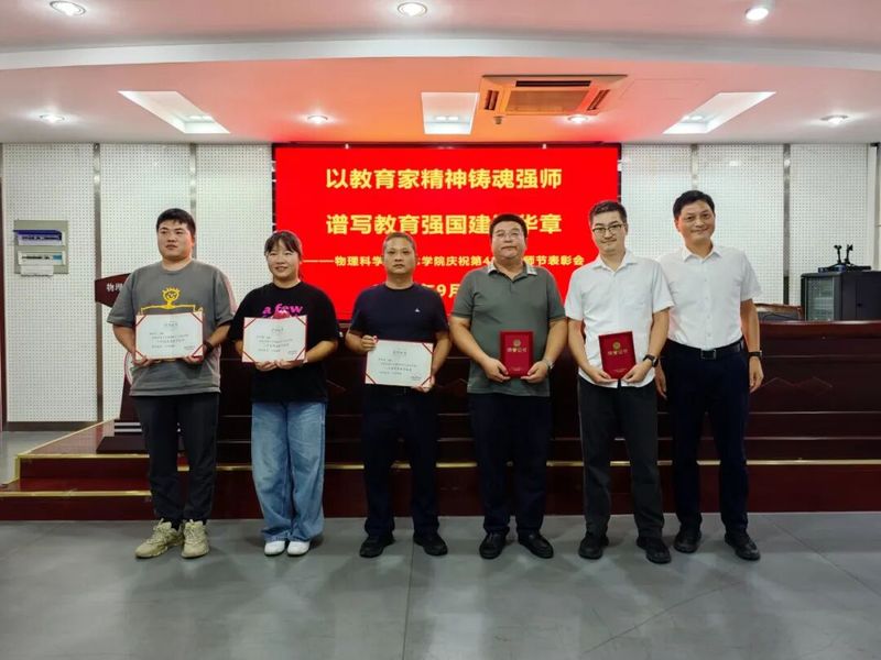 五位“人才培养突出贡献奖”获得者中,杨俊义、徐亚东、孟林兴、卢兴园四位老师指导学生参与“三大赛”和物理榜单赛事取得奖项的重大突破;罗杰老师指导本科生以第一作者身份将论文发表在物理学领域国际顶刊Physical Review Letters上。两位“科研成果突出贡献奖”获得者中,冯岩老师面向国家重大需求开展科研工作,重大项目获立项资助;王孟老师三年磨一剑,在Nature Material发表学术成果。苏晓东老师积极开拓校企合作新路径,与多家企业达成卓越工程师联合培养,获“对外合作突出贡献奖”。田文得、史振中两位老师对学生亦师亦友,悉心指导,润物无声,以责任担当书写育人华章,获“成长陪伴突出贡献奖”。