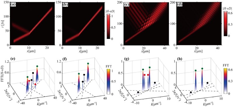 为了解决时空界面上出现的反射问题,研究团队在时空系统中提出了一种时空超材料,即广义四分之一波长阻抗变换器。当时空超材料的特性和厚度满足一定条件时,波将被完全抑制。这种现象与空间四分之一波长阻抗变换器非常相似。由于与空间对应物相同,研究团队将这样一个具有特定折射率和时空厚度的时空超材料称为广义四分之一波长阻抗变换器。在亚光速移动界面或超光速移动界面上,相对普通情况,加了时空四分之一波长阻抗变换器后,反射波在相应区域明显是被完全抑制的(图2)。