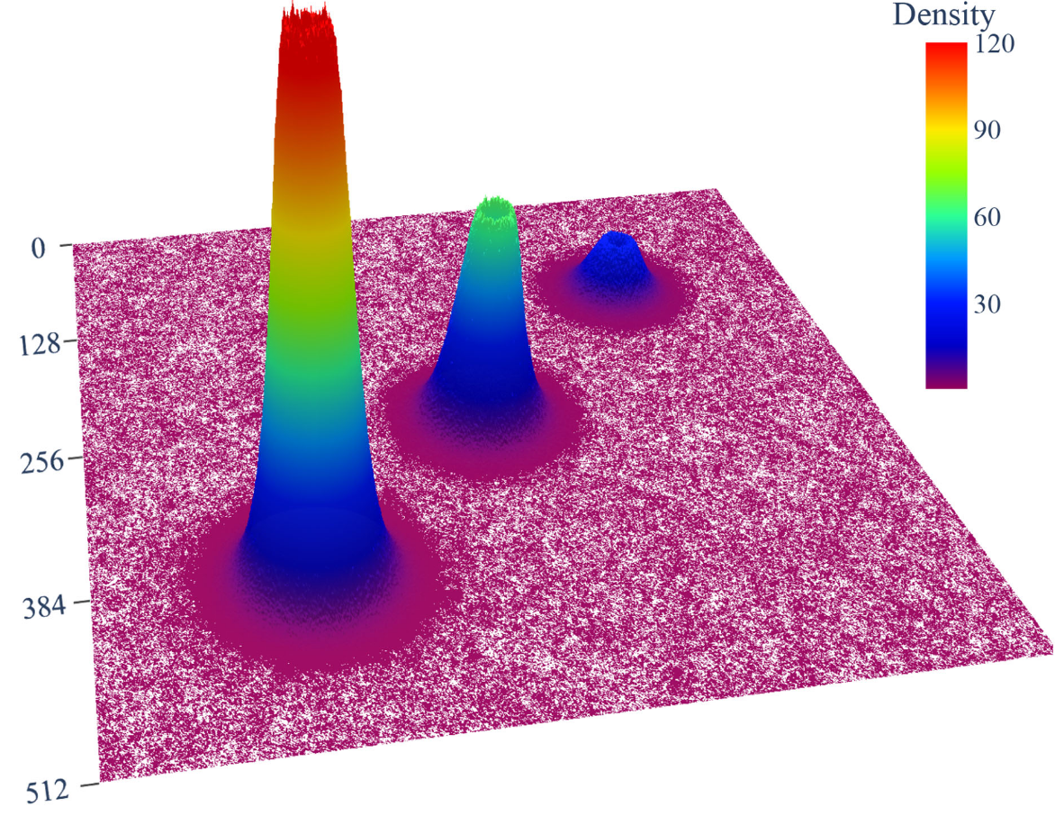 在活性物质系统中,通过自发相分离机制行为形成类似气液共存状态的现象普遍存在。这种相分离行为不仅出现在较为简单的“标量场”活性物质中(如运动诱导的相分离),而且在具有连续旋转对称的矢量对齐活性物质系统中也会发生,通常来源于自发有序过程中的动力学失稳机 制。然而,对于由点状手性活性粒子组成的二维极化或向列型对齐系统,研究发现体系的自发聚集并不遵循通常的相分离图像。研究表明,这些密集有序的高度局域化的结构并不是典型的宏观相分离或者微相分离结构,而是一类凝聚体:这些高密度态可以吸收系统中宏观比例的粒子,并且随着吸收粒子数量的增加保持尺寸的高度局域化(见图1)。