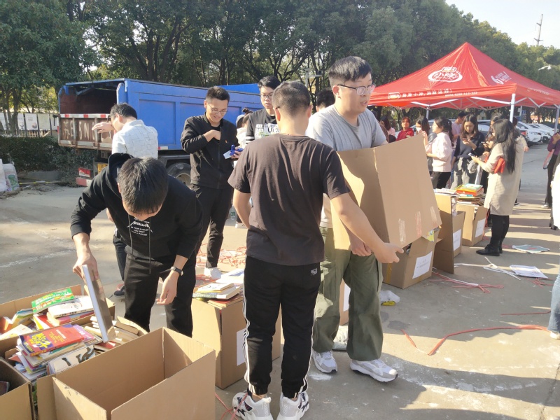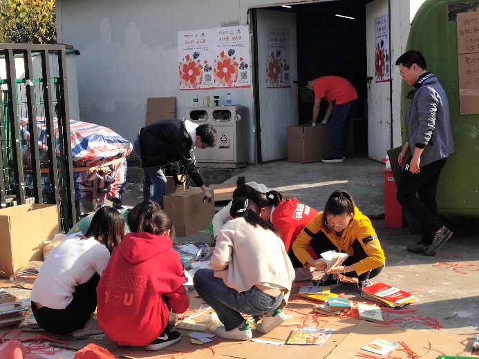 来到斜塘街道莲香社区后,同学们在社区志愿者的安排下分工合作,男生负责把图书从仓库搬出来,女生负责给图书分类(包括学前、小学新书、小学无破损残缺可用、初中、高中及以上、废弃六类),然后放到贴有标签的纸箱里,再由男生整理打包后搬入仓库。在分类整理的过程中,负责人讲到这些图书是社会各界爱心人士捐赠的,其中司机社 里学生捐赠的图书经过了老师的筛选,同时也是学生自己看过的、感兴趣的,志愿者整理完之后,公益联合会的会长还会再亲手整理一遍,确保每一本书都是适合山区孩子阅读的。捐赠的图书种类繁多,承载着对山区孩子们的爱心和祝福,但是有些图书过于陈旧或者破损,从孩子阅读的角度来考虑,分类整理显得尤为重要,整理让山区的孩子们不仅有书看,还有更好的阅读体验。