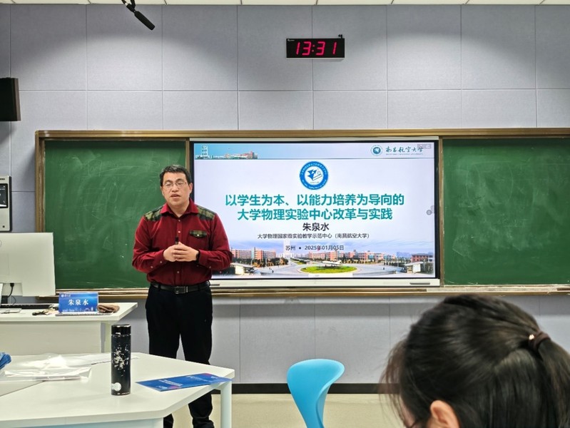 第二场报告是南昌航空大学朱泉水老师带来的《以学生为本、以能力培养为导向的大学物理实验中心改革与实践》,报告讲述了南昌航空大学物理实验课程设置、实验教学设计和考核以及学生能力培养等方面的改革与实践,在场教师深受启发。