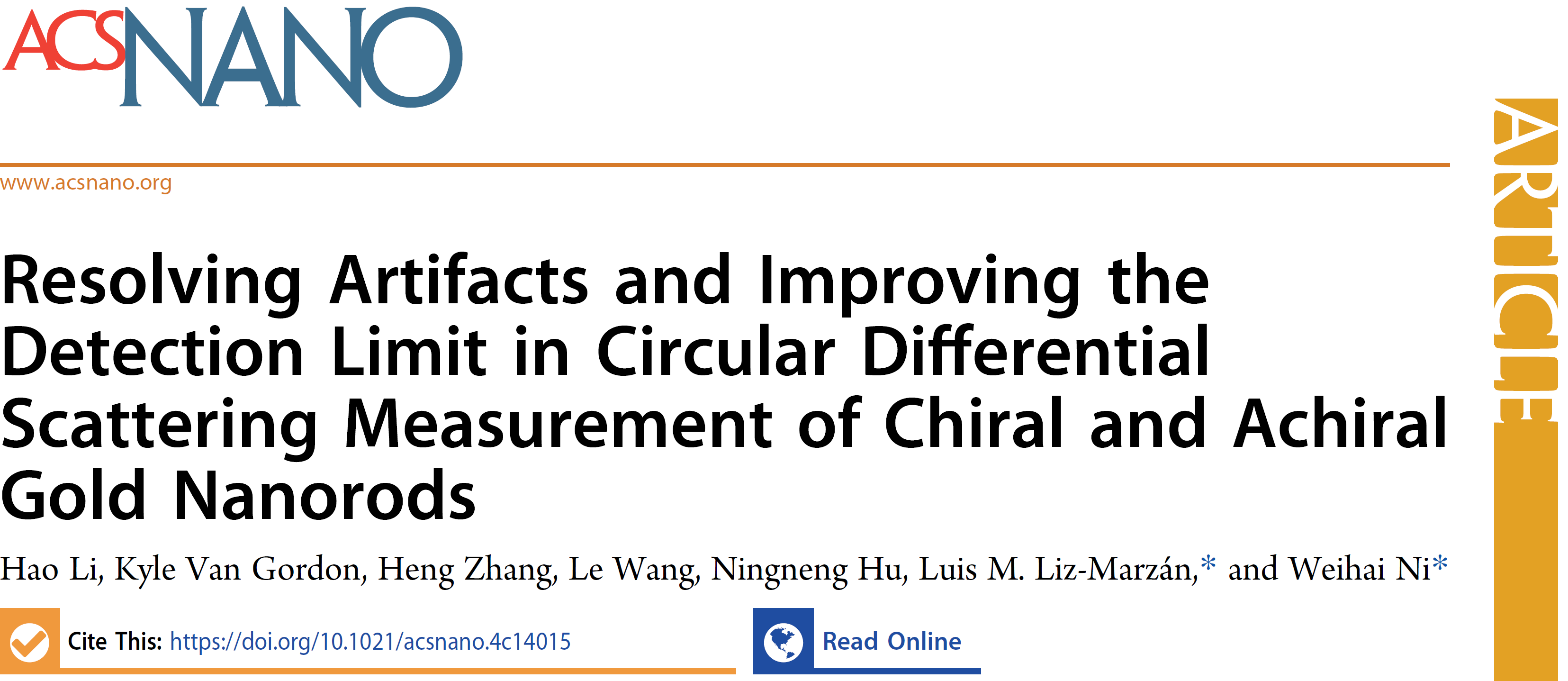江苏省前沿材料物理与器件重点实验室为第一单位、以“Resolving Artifacts and Improving the Detection Limit in Circular Differential Scattering Measurement of Chiral and Achiral Gold Nanorods”为题发表在《ACS Nano》上(影响因子IF=15.8)。