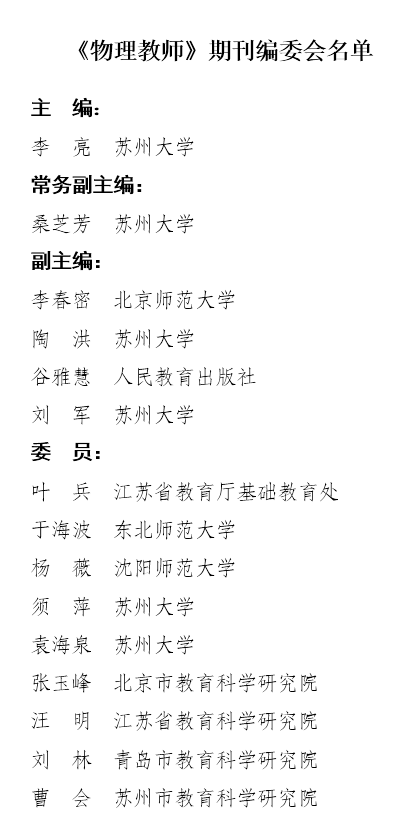 的基本情况,他希望《物理教师》期刊继续坚持“求新、求实、求活”的办刊宗旨,加强与专家、编委、作者和读者的交流与合作,服务广大物理教师,进一步提升期刊质量,扩大影响力。