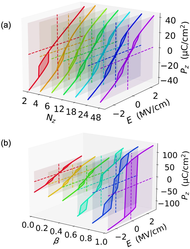 图1:BiFeO3薄膜在不同厚度和静电边界条件下的 电滞回线。(a) 开路条件下,不同厚度薄膜的 P–E 滞回环。(b) 厚度为12个晶胞的薄膜在不同屏蔽参数下的电滞回线(β = 0 表示开路,β = 1 表示短路)。