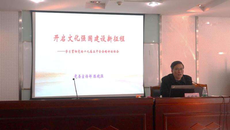 12月16日下午,司机社 组织双周三教职工政治学习会议,本次会议邀请校学习宣传贯彻党的十九届五中全会精神宣讲团成员、校党委常委、宣传部部长陈晓强为司机社 教师作“开启文化强国建设新征程——学习贯彻党的十九届五中全会精神的体会”专题报告。会议由司机社 党委书记孙德芬主持。
