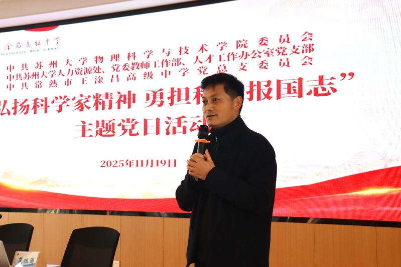 揭牌仪式后,常熟市王淦昌高级中学原党总支书记范祖国以《王淦昌的科学成就和科学家精神》为题讲授专题党课。深耕王淦昌精神研究的范祖国书记,用鲜活史料和生动细节,还原了这位“两弹一星”功勋科学家的传奇人生。王淦昌先生横跨多学科领域,在中微子研究、反西格马负超子发现、两弹研制、激光惯性约束核聚变概念、自主核电发展等方面均取得里程碑式成就。54岁时,他化名“王京”以身许国,隐身青海核基地17年,成为我国核武器研制的主要奠基人之一。党课聚焦其“爱国奉献、严谨治学、勇攀高峰”的精神核心,让在场党员接受了一次深刻的精神洗礼和党性教育。