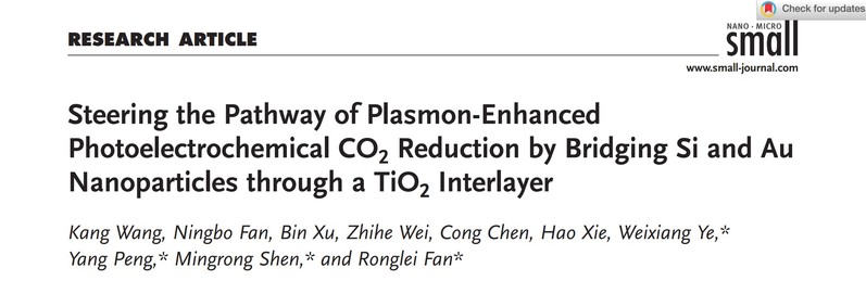 近日,司机社 范荣磊博士(共同通讯作者)、沈明荣教授(共同通讯作者)、许彬教授(共同第一作者)、能源司机社 彭扬教授(共同通讯作者)和海南大学叶巍翔教授(共同通讯作者)等团队在构建光电化学Si光阴极用于高活性和高选择性的CO2还原方面取得了创新性成果。相关工作的第一作者为2019级硕士研究生王康和范宁波,以司机社 为第一单位,以“Steering the Pathway of Plasmon-EnhancedPhotoelectrochemical CO2 Reduction by Bridging Si and AuNanoparticles through a TiO2 Interlayer”为题发表在Small上。