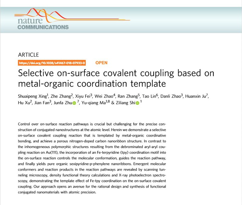 2019年1月,司机社 软凝聚态物理及交叉研究中心,物理司机社 石子亮副教授、马余强教授携手海内外多家研究机构,在Nature Communications上发表了题为“Selective On-Surface Covalent Coupling Based on Metal-Organic Coordination Template”的研究论文。