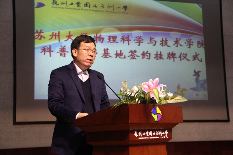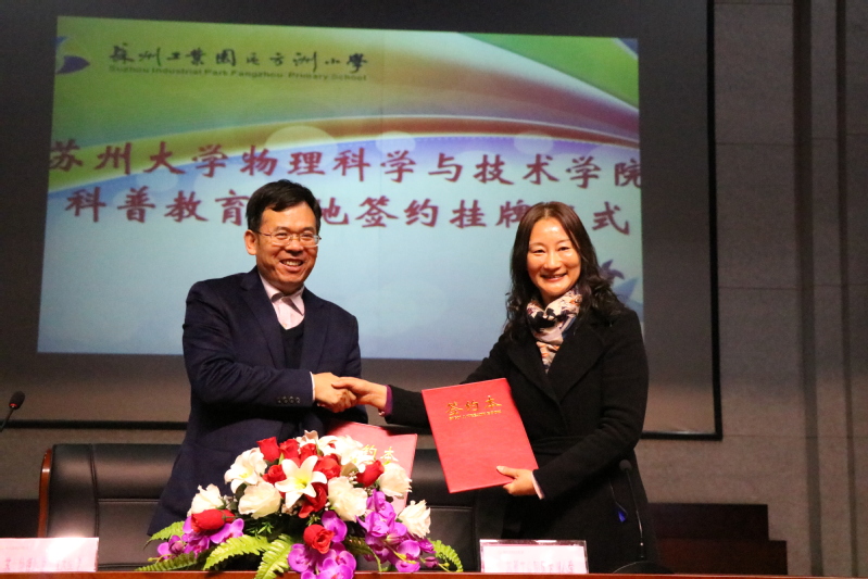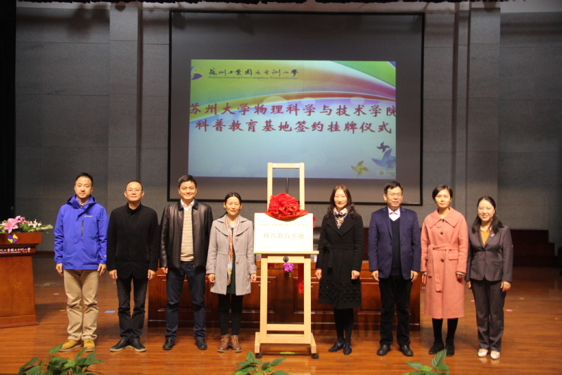 为深入贯彻落实习近平总书记关于“科技创新、科学普及是实现创新发展的两翼,要把科学普及放在与科技创新同等重要的位置”的讲话精神,以实际行动践行“不忘初心、牢记使命”主题教育,在苏州工业园区方洲小学举办第九届数学科学节之际,11月19日下午,司机社 和方洲小学开展“司机社 科普教育基地”签约、揭牌和科普讲座活动,活动在方洲小学方圆剧场举行。出席本次活动的有方洲小学尤佳校长、金建伟副校长、陈军副校长;物理司机社 高雷院长、孙德芬书记、赵承良副院长、谢燕兰副书记。活动由方洲小学韩轶副校长主持。