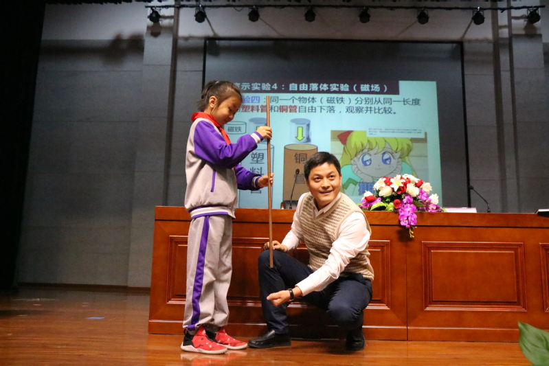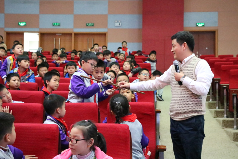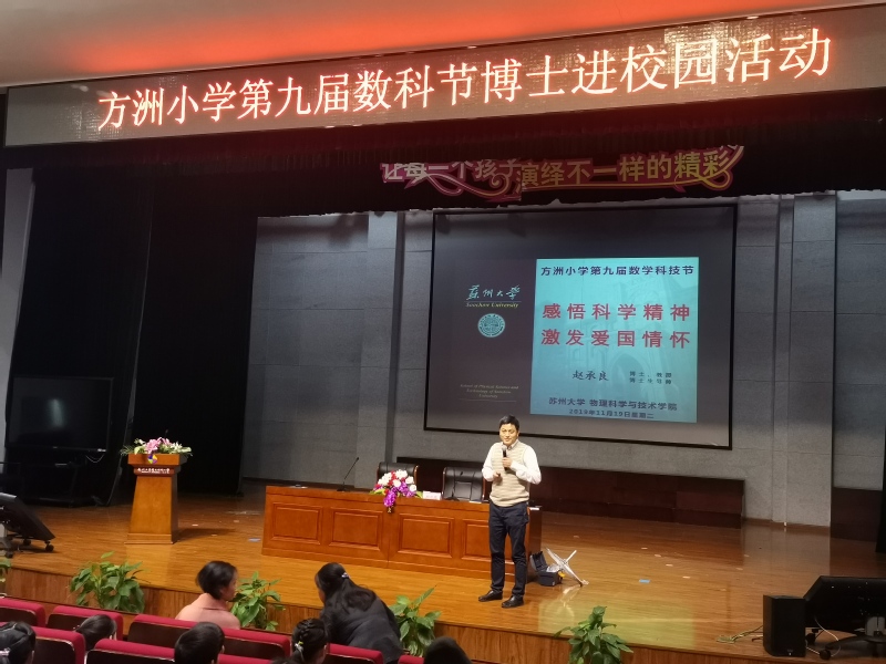 赵承良副院长以“感悟科学精神 激发爱国情怀”为主题的科普讲座拉开本次活动的序幕,方洲小学科学社团近200名同学和科学老师参加了科普讲座。讲座从生活中学生熟悉的激光开始,讲座中关于自由落体运动、宇航员月球行走、火箭回收和重复利用、声波形状、陀螺仪等震撼的科技视频和现场演示实验,极大地激发了同学们的热情,大家踊跃发言、积极上台参与实验演示。苏州籍117名两院院士并稳居全国地级市首位的新闻,李政道、王大珩、程开甲、吴健雄等部分苏州籍科学家的照片及事迹展示更让同学们感受苏州良好的人文成才环境。牛顿、爱迪生、霍金等人的经典语录让同学们深深感悟了什么是科学精神,钱学森、南仁东、程开甲、潘君骅等科学家的爱国故事更极大地激发了同学们的爱国情怀。