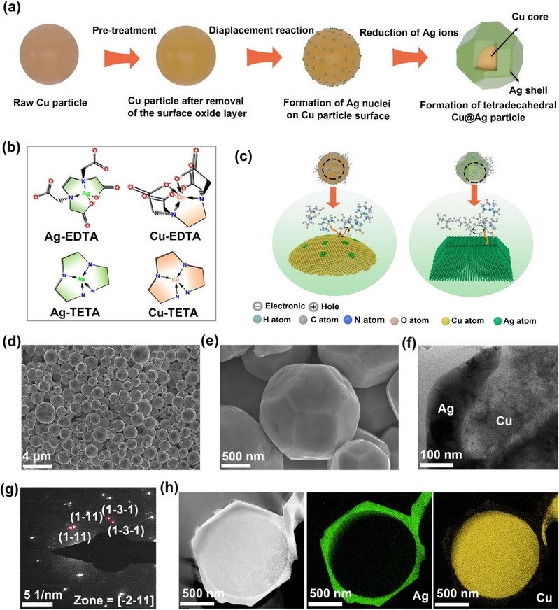 针对这些问题,近日司机社 邹帅副研究员-苏晓东教授课题组提出通过制备一种具有大银壳晶粒的新型十四面体银包铜粉来提高异质结电池低温导电浆料用银包铜粉的长期可靠性和导电性。具体地讲,银包铜粉的银壳是由银纳米晶组成,这些纳米晶之间的晶界会引发去润湿现象,并可作为氧气从银壳进入铜核的通道,减少银壳的晶界可以提高银包铜粉的热稳定性和抗氧化性,相同面积下增加银壳晶粒尺寸等同于减小晶界。络合剂的选择是银包铜粉制备的关键,它即决定了镀液的稳定性,又决定了银镀层的性质。多数研究都使用氨水作为制备银包铜粉的银离子络合剂,但银氨络离子不稳定,一旦镀液发生自分解后制备的银包铜粉表面会非常粗糙。在该工作中,研究人员使用三乙烯四胺(TETA)和乙二胺四乙酸二钠(EDTA·2Na)作为复合络合剂,TETA用于抑制银离子水解,EDTA·2Na用于提高银离子的沉积速率获得光滑致密的银壳。在优化TETA、EDTA·2Na的用量和调整银溶液的滴加速率后,可获得具有大银壳晶粒的十四面体银包铜粉。该十四面体银包铜粉具有优异的热稳定性和抗氧化性,在空气中250℃热处理30 min未氧化且未出现银壳脱湿现象,且在空气中进行200 h湿热实验(80℃,80% r.h.)以及常温放置3个月均为发生氧化。另外,实验和模拟结果都表明,由于更大的颗粒间接触面积,该十四面体银包铜粉的导电性优于传统的球形银包铜粉。