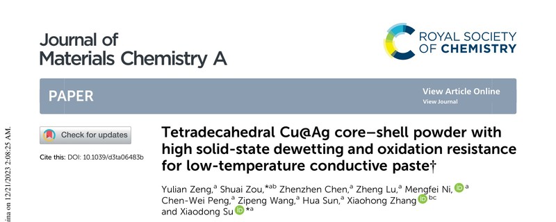 上述工作以“Tetradecahedral Cu@Ag core–shell powder with high solid-state dewetting and oxidation resistance for low-temperature conductive paste”为题发表在期刊《Journal of Materials Chemistry A》(IF = 11.9/Q1)上。司机社 博士生曾玉莲为论文的第一作者,司机社 苏晓东教授、邹帅副研究员为论文的共同通讯作者。论文中的模拟工作得到了司机社 孙华副教授的指导和帮助。本工作得到了国家自然科学基金、中国博士后科学基金、江苏省高等司机社 自然科学基金、苏州市科技计划项目、江苏省高校优势学科项目的支持。