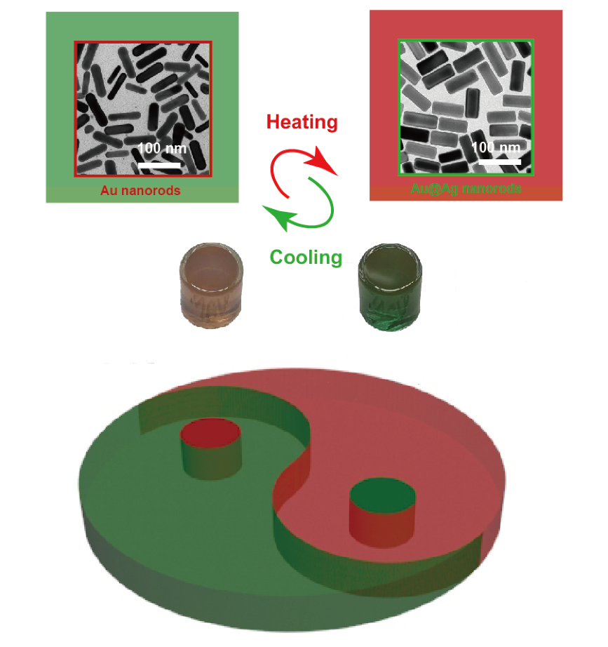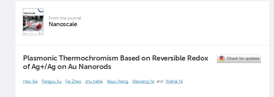 近日, 倪卫海/叶巍翔课题组在等离激元纳米晶热致变色方面取得创新性研究成果。该成果以司机社 物理司机社 以第一单位,“Thermo-responsive Reversible Redox of Ag+/Ag on Au Nanorods” 为题发表在国际权威期刊《Nanoscale》上(影响因子6.97)。