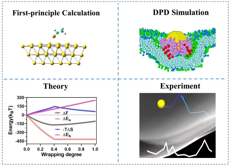 图1. 结合第一性原理计算、耗散粒子动力学模拟、统计热力学理论和高分辨成像实验等多种研究手段,深刻揭示配体嫁接策略影响纳米颗粒内吞行为的内在机制。