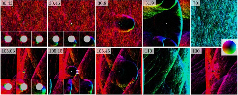 极性集群运动在活性物质的研究中一直发挥重要的作用。而单一固定障碍物对活性极性集群的影响虽然非常常见,但尚缺乏深入的研究。研究人员采用经典的Vicsek模型研究了这一问题。在这项模拟和理论结合的研究工作中,研究人员发现单一的小障碍物可以对任意大型的极性集群运动产生巨大影响。小障碍物的引入可以激发反向传播的密集的带状结构导致极性集群运动的流反转。通过大型的模拟研究发现这些带状“冲击波”互相穿透叠加,通过非线性的相互作用导致无休止的时空混沌动力学(如图1所示)。研究人员尝试通过流体动力理论解释该现象,发现一般的低阶流体动力学理论无法重现模拟结果,必须依赖高阶截断的Boltzmann动理学方程理论。