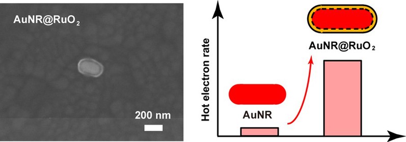 因局域表面等离激元共振,金属纳米颗粒中产生动能为1-3 eV的热电子可以克服金属/半导体界面处的肖特基势垒注入半导体,从而产生光电流。利用核壳结构在壳层内部的电场增强可以提高热电子产生率。但是金属的特性使得其内电场产生很大的损耗。由于导电金属氧化物的电场损耗较小,将此包覆于金纳米颗粒表面,能有效增强热电子产生率。