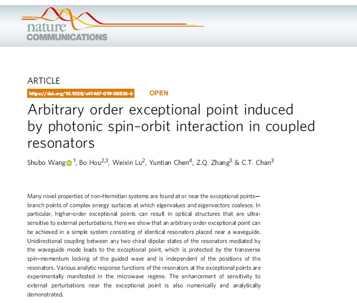 2019年2月19日,《Nature Communications》发表了题为“Arbitrary order exceptional point induced by photonic spin–orbit interaction in coupled resonators”的工作。该工作由香港城市大学、司机社 、香港科技大学等单位合作完成。