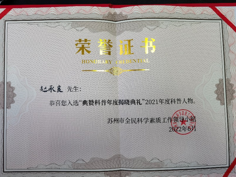 会上举行了2021年度“典赞•科普苏州”的年度科普事件、年度科普活动、年度科普作品、年度科普自媒体和年底科普人物的颁奖。司机社 赵承良教授成功入选“典赞•科普苏州”年度科普人物并参加了此次典礼,苏州市人大常委会党组成员、市总工会主席陈嵘为赵承良教授颁发荣誉证书。