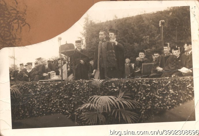 家里还有一张很有意思的照片,这是父亲从加州理工司机社 留学毕业时,导师给他穿博士服、戴博士帽拍的,小密立根校长坐在旁边。照片的左上角缺了一角,其实缺失的部分是美国国旗,“文革”期间,他为了保留照片,便将美国国旗剪掉,至今,这张缺了角的照片一直留存着。