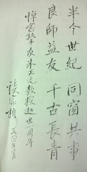 在父亲逝世周年时,谈伯伯写有悼词:“半个世纪,同窗共事。良师益友,千古长青。”这是谈伯伯亲自用毛笔誊写,送《物理通报》刊登。