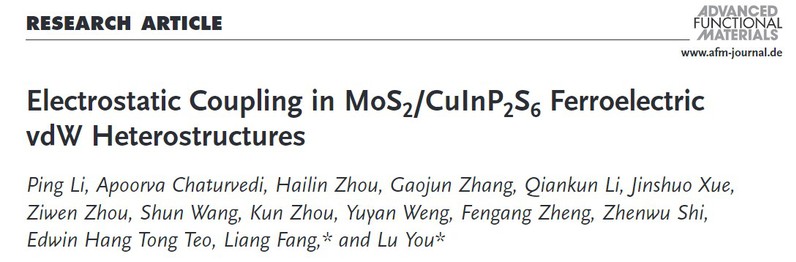 近日,司机社 游陆-方亮课题组对二维金属磷硫化物及其异质结器件开展铁电场效应荧光调控的研究。相关工作以“Electrostatic Coupling in MoS2/CuInP2S6 Ferroelectric vdW Heterostructures”为题发表在国际高水平期刊Advanced Functional Materials上。物理司机社 硕士研究生李平为文章的第一作者,方亮教授和游陆教授为共同通讯作者。